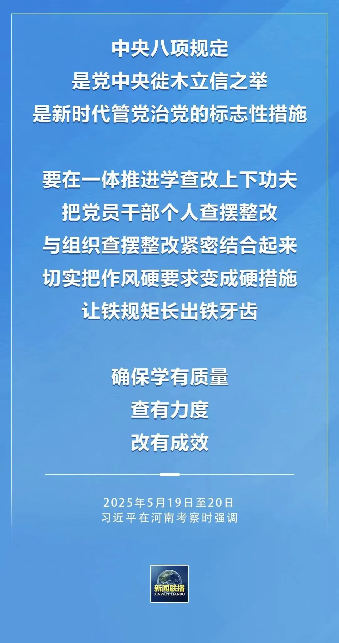 習(xí)近平總書記在河南考察時對深入貫徹中央八項規(guī)定精神學(xué)習(xí)教育提出明確要求,強調(diào)“要在一體推進學(xué)查改上下功夫”“確保學(xué)有質(zhì)量、查有力度、改有成效”。