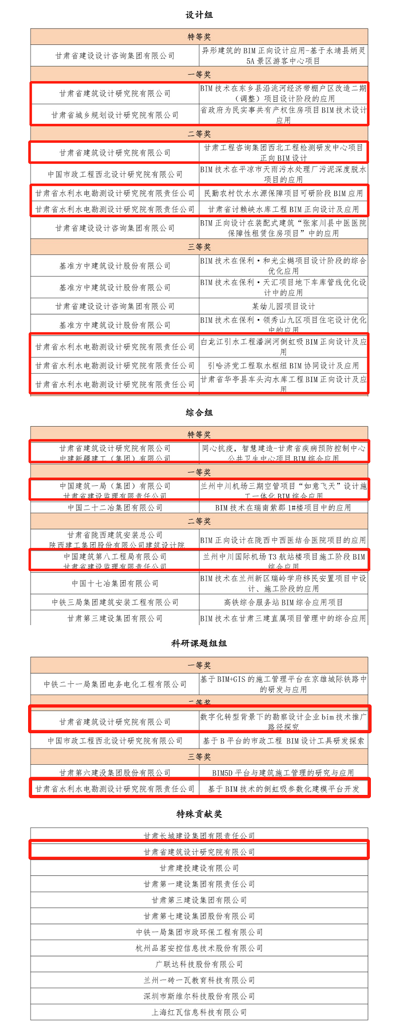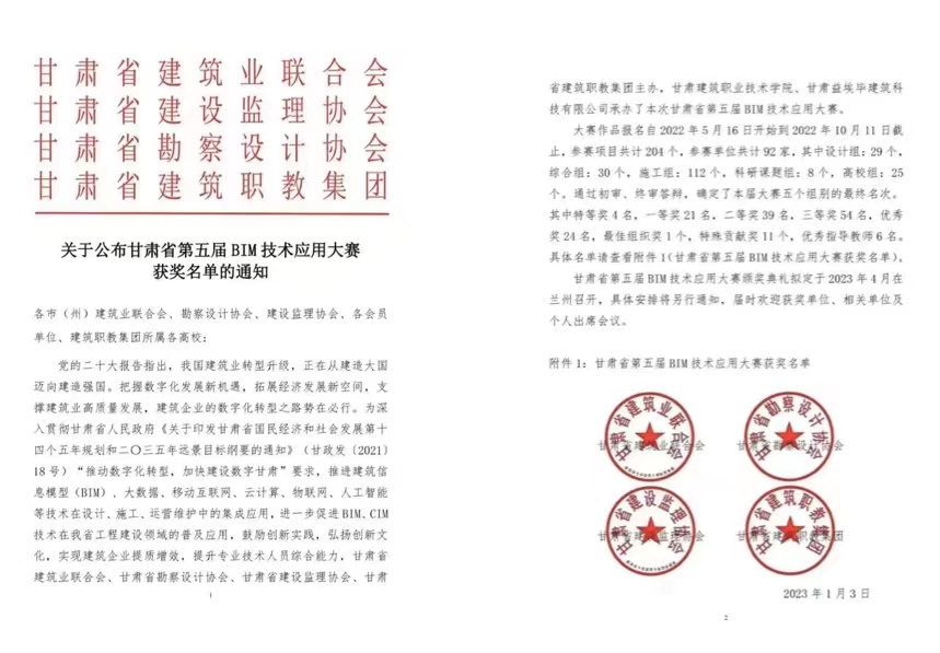 日前,甘肅省第五屆BIM技術(shù)應(yīng)用大賽結(jié)果公布,甘肅工程咨詢集團(tuán)共獲得14個(gè)獎(jiǎng)項(xiàng),其中,“BIM技術(shù)在東鄉(xiāng)縣沿洮河經(jīng)濟(jì)帶棚戶區(qū)改造二期(調(diào)整)項(xiàng)目設(shè)計(jì)階段的應(yīng)用”等8個(gè)項(xiàng)目分別獲設(shè)計(jì)組一、二、三等獎(jiǎng),“同心抗疫,智慧建造—甘肅省疾病預(yù)防控制中心公共衛(wèi)生中心項(xiàng)目BIM綜合應(yīng)用”等3個(gè)項(xiàng)目分別獲綜合組特等獎(jiǎng)及一、二等獎(jiǎng),“數(shù)字化轉(zhuǎn)型背景下的勘察設(shè)計(jì)企業(yè)BIM技術(shù)推廣路徑探究”等2個(gè)項(xiàng)目分別獲科研課題組二、三等獎(jiǎng),建筑設(shè)計(jì)院獲特殊貢獻(xiàn)獎(jiǎng)。