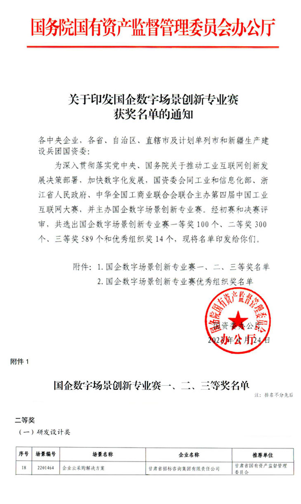 近日,國務(wù)院國資委公布了首屆“國企數(shù)字場景創(chuàng)新專業(yè)賽”獲獎名單。甘肅工程咨詢集團組織推薦的“甘招企業(yè)云采購平臺”創(chuàng)新場景,在全國2007家參賽企業(yè)推薦的3277個場景中脫穎而出,榮獲二等獎!