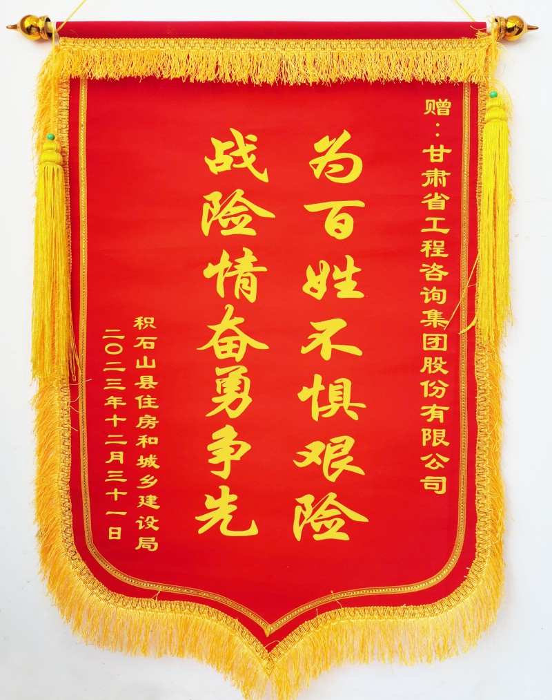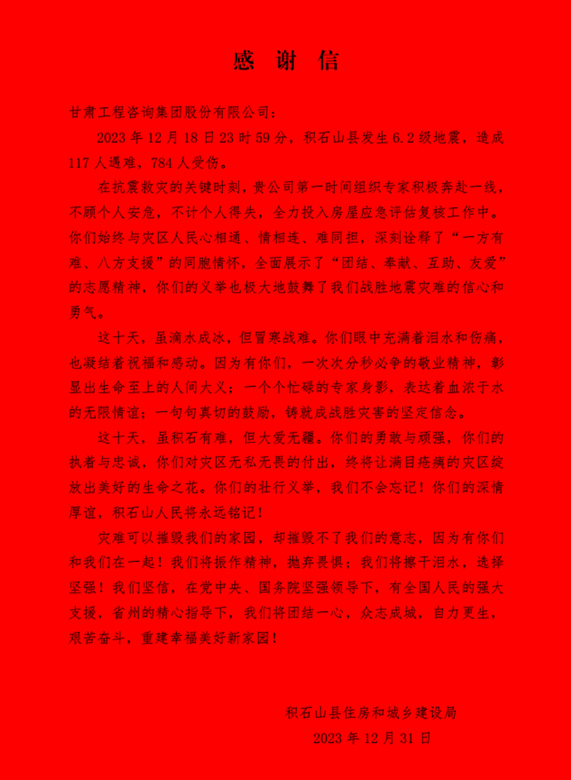 1月3日上午,積石山縣住房和城鄉(xiāng)建設(shè)局向甘肅工程咨詢集團贈送“為百姓不懼艱險,戰(zhàn)險情奮勇爭先”錦旗,并發(fā)來《感謝信》,對在抗震救災(zāi)關(guān)鍵時刻奔赴災(zāi)區(qū)開展房屋應(yīng)急評估工作的專家表達感謝和敬意。