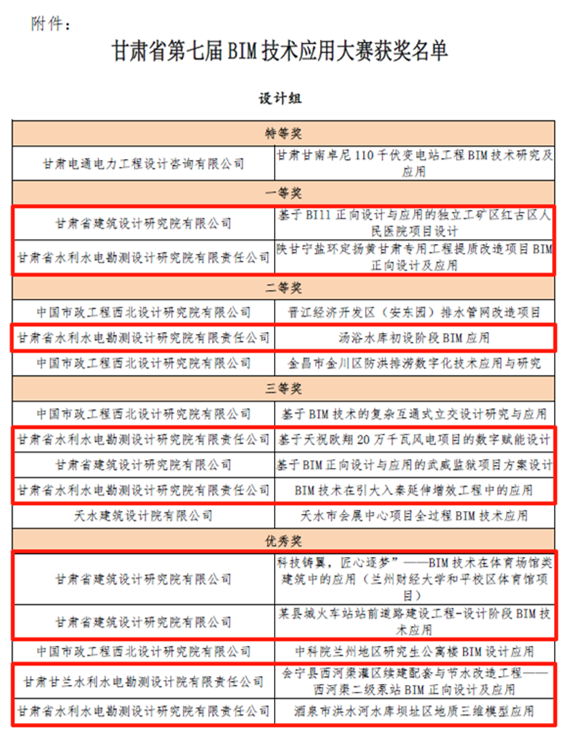 在甘肅省第七屆BIM技術(shù)應(yīng)用大賽中,建筑設(shè)計(jì)院、水電設(shè)計(jì)院報(bào)送的項(xiàng)目共斬獲12項(xiàng)獎(jiǎng)勵(lì),包攬了設(shè)計(jì)組16個(gè)獎(jiǎng)項(xiàng)中的10項(xiàng)。在甘肅省第五屆“創(chuàng)新杯”工業(yè)設(shè)計(jì)大賽中,水電設(shè)計(jì)院《引調(diào)水工程數(shù)字化BIM建模平臺(tái)》項(xiàng)目獲優(yōu)秀獎(jiǎng)。在第十七屆全省職工優(yōu)秀技術(shù)創(chuàng)新成果獎(jiǎng)中,水電設(shè)計(jì)院、土木工程院申報(bào)的兩個(gè)項(xiàng)目分獲創(chuàng)新成果獎(jiǎng)三等獎(jiǎng),其中,《棄渣場三維設(shè)計(jì)平臺(tái)》項(xiàng)目是全省水利系統(tǒng)唯一獲獎(jiǎng)成果。