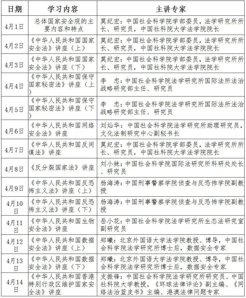 學(xué)習(xí)總體國家安全觀的主要內(nèi)容和特點、國家安全法、國防法、反分裂國家法、反間諜法、保守國家秘密法、反恐怖主義法等。朗讀法律全文。專家講座配備有競答試題。