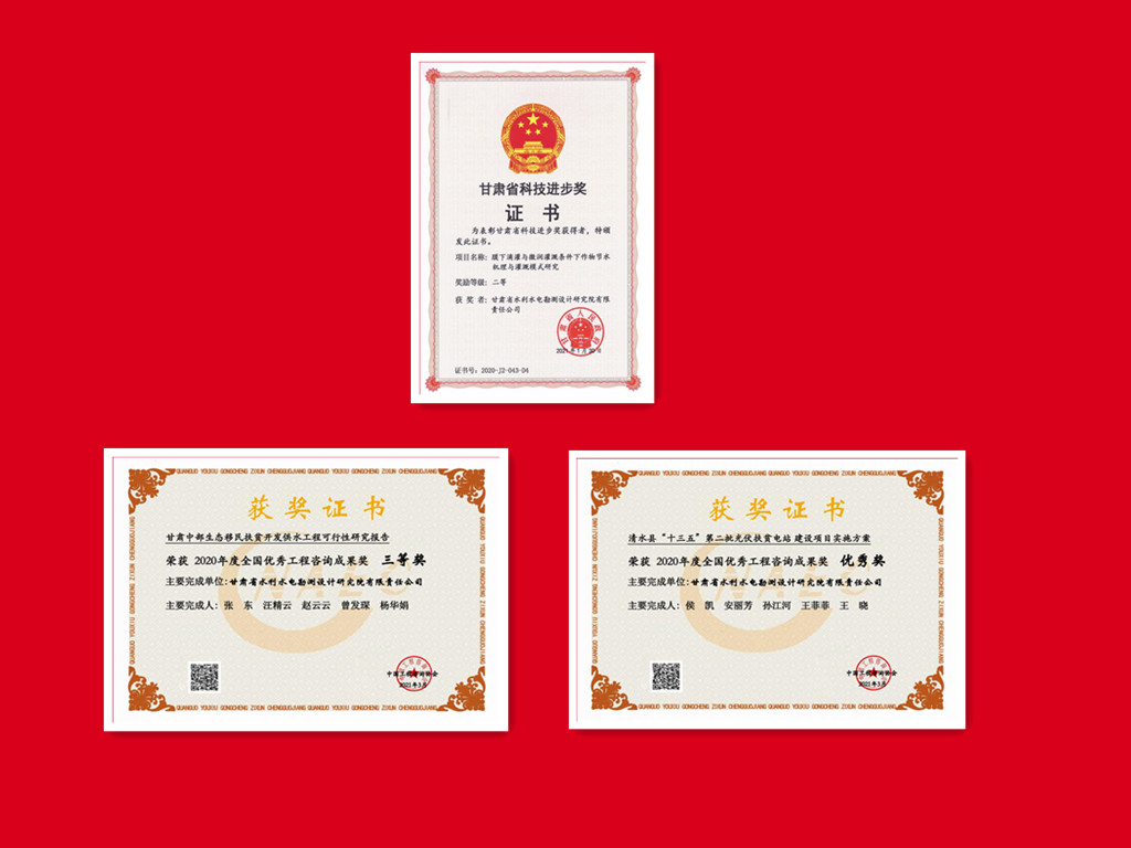 科研成果在工程實踐中開花結(jié)果,多個項目獲技術(shù)表彰獎勵:《民勤縣紅崖山水庫加高擴建工程》獲甘肅省優(yōu)秀工程勘察設(shè)計一等獎;《石羊河流域重點治理項目西營河專用輸水渠工程》《古浪縣生態(tài)移民暨扶貧開發(fā)黃花灘項目水利骨干工程》《大通河納子峽水電站工程地質(zhì)勘察》《昌馬水庫樞紐工程地質(zhì)勘察》分別獲甘肅省優(yōu)秀工程勘察設(shè)計二等獎;《甘肅中部生態(tài)移民扶貧開發(fā)供水工程可行性研究報告》獲全國優(yōu)秀工程咨詢成果獎三等獎;《清水縣“十三五”第二批光伏扶貧電站項目》獲全國優(yōu)秀工程咨詢成果獎優(yōu)秀獎。