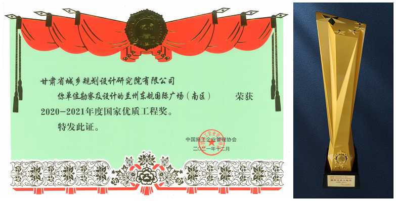 甘肅省城鄉(xiāng)規(guī)劃設(shè)計(jì)研究院勘察、設(shè)計(jì)的“蘭州東航國際廣場(chǎng)(南區(qū))項(xiàng)目”榮獲“2020—2021年度國家優(yōu)質(zhì)工程獎(jiǎng)”。此前,該項(xiàng)目已榮獲2020年工程建設(shè)項(xiàng)目綠色建造設(shè)計(jì)水平評(píng)價(jià)三等成果、2020年度甘肅省優(yōu)秀工程勘察設(shè)計(jì)三等獎(jiǎng)等多項(xiàng)榮譽(yù)。