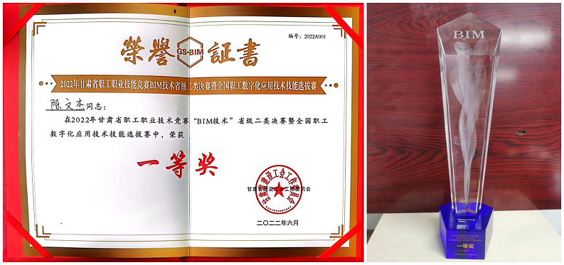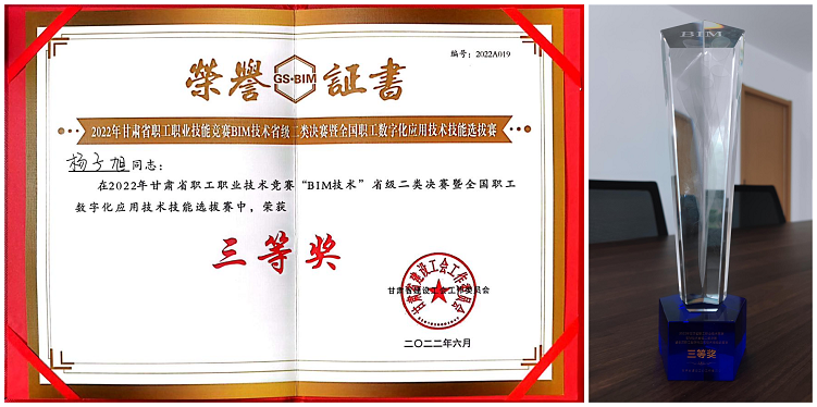 近日,在甘肅省職工職業(yè)技能競賽“BIM 技術(shù)”省級二類決賽暨全國職工數(shù)字化應(yīng)用技術(shù)技能選拔賽中,甘肅省建筑設(shè)計研究院有限公司榮獲優(yōu)秀組織獎,選送的參賽選手陳文杰和楊子旭分別榮獲一、三等獎。