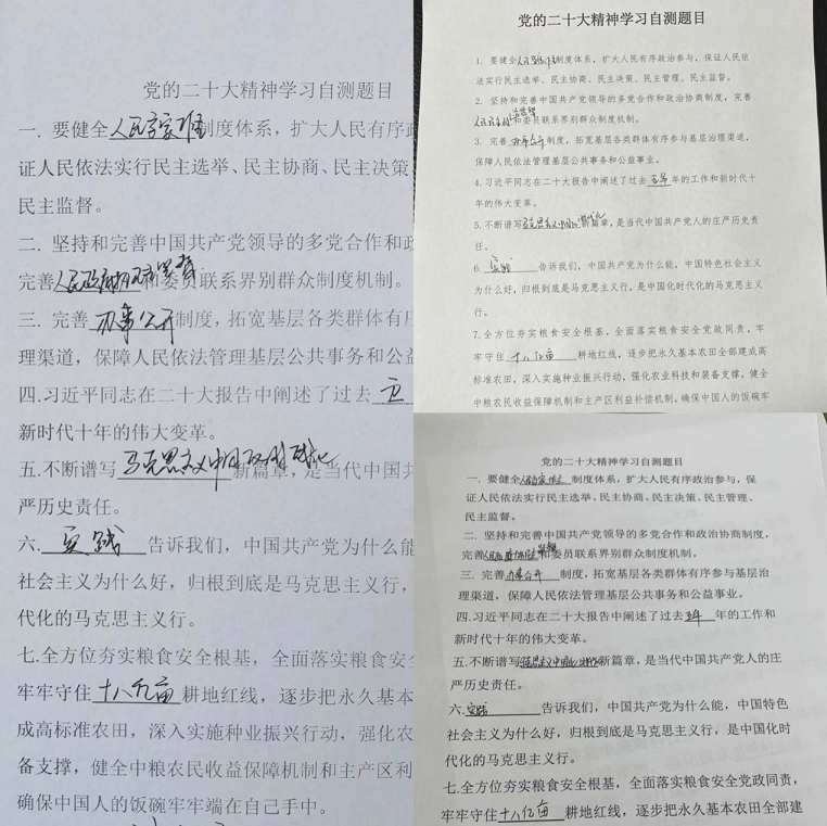 開展答卷測試,檢驗學習成效。招標咨詢集團第三黨支部所屬咨詢中心采取線上視頻會議的方式組織全體黨員居家學習黨的二十大報告原文,通過學原文、悟原理、反復學、時常悟,深刻領會和準確把握報告的精神實質(zhì)、豐富內(nèi)涵和核心要義。同時,對黨的二十大報告相關知識開展應知應會測試,通過答卷的方式檢驗黨員干部對黨的二十大精神的理解和把握,達到以考促學、以學促用、學用結(jié)合、知行合一的目的。